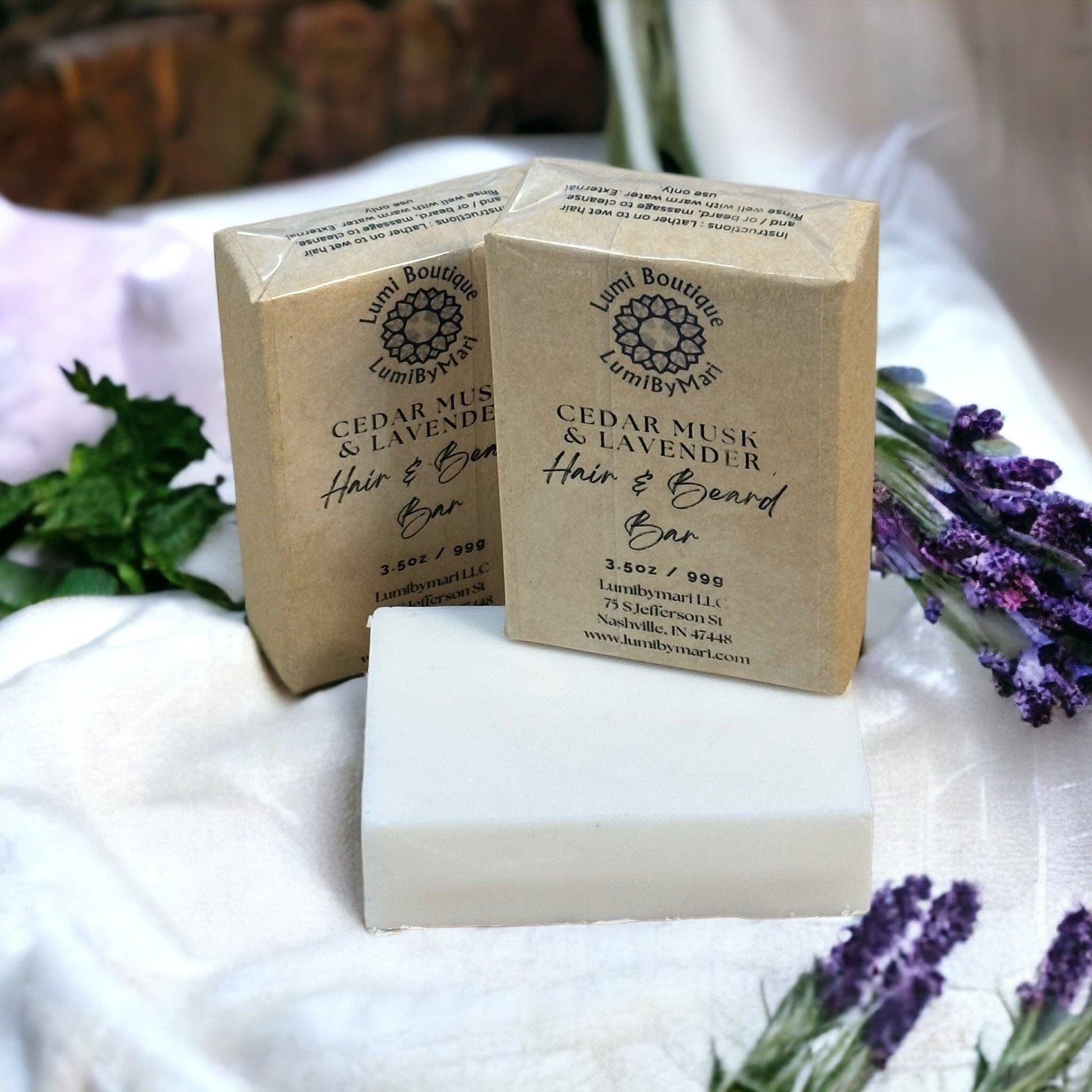 Hair & Beard Wash Bar that has been specifically formulated to cleanse the hair without drying it under the skin barrier. Mild, fresh woodsy and Cedar Musk & Lavender Scent .