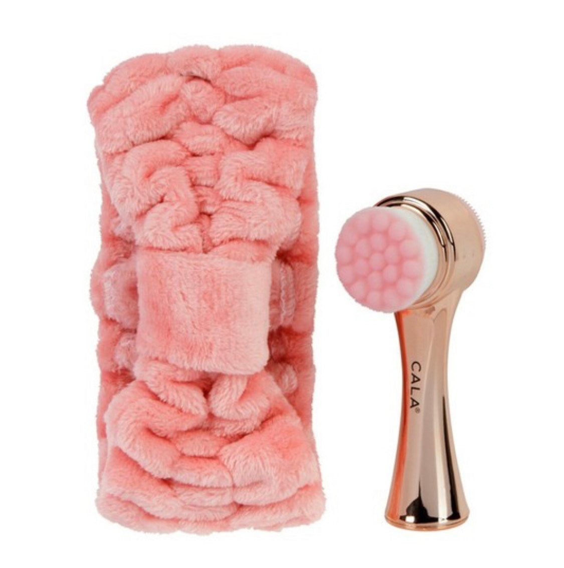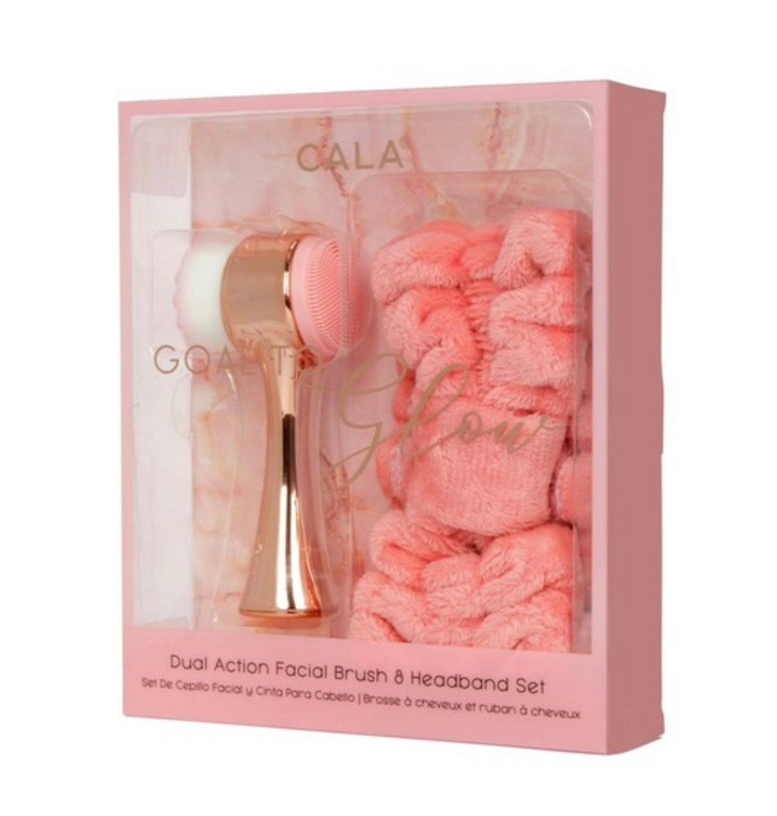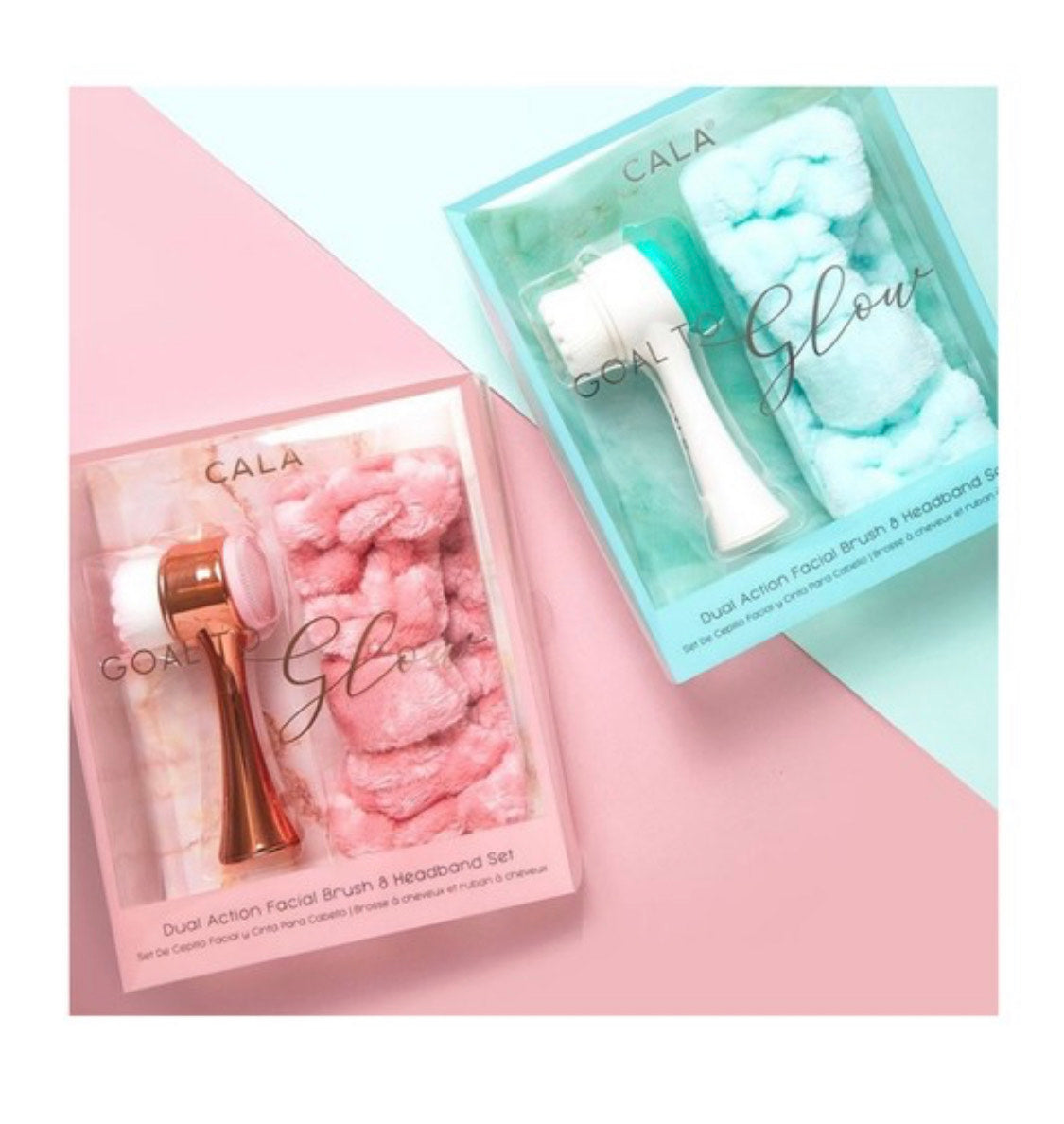 Rose Gold Goal To Glow Dual action facial brush and headband set. This set allows to create a renewing at home spa experience for a deep invigorating facial cleanse. Keeping hair perfectly out of the way. Comes in two colors pink and aqua.
