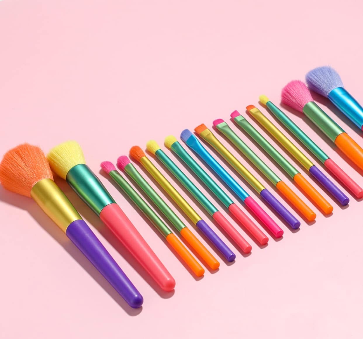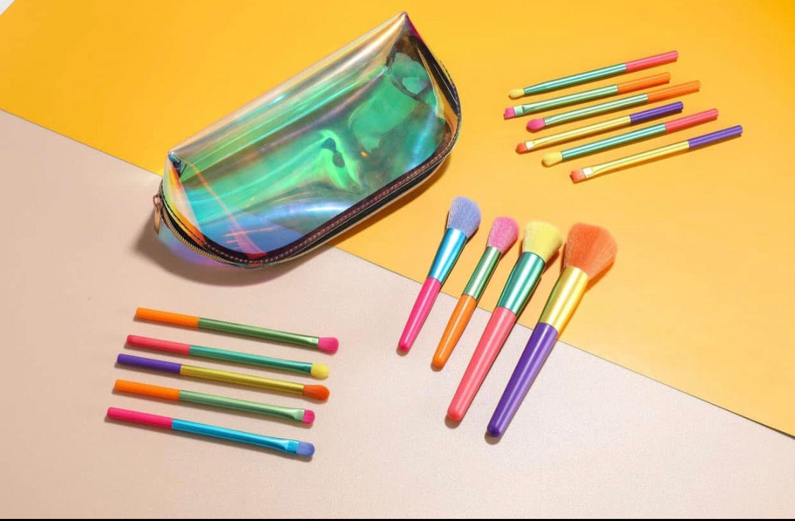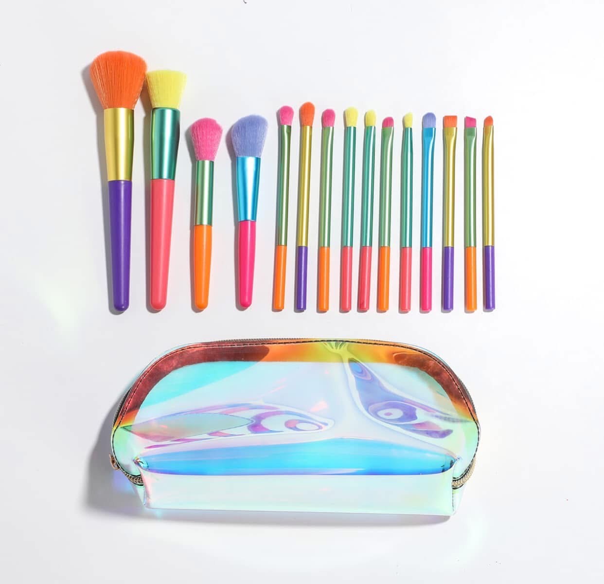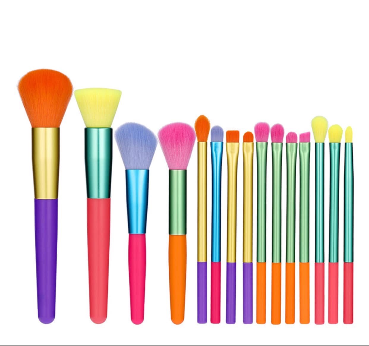 15pc Multi-colored brush set,with a metallic bag. A simple must haves to add to your collection.It's sturdy, fashionable and great for traveling. It is made with soft bristles with a nice polish wooden grip.