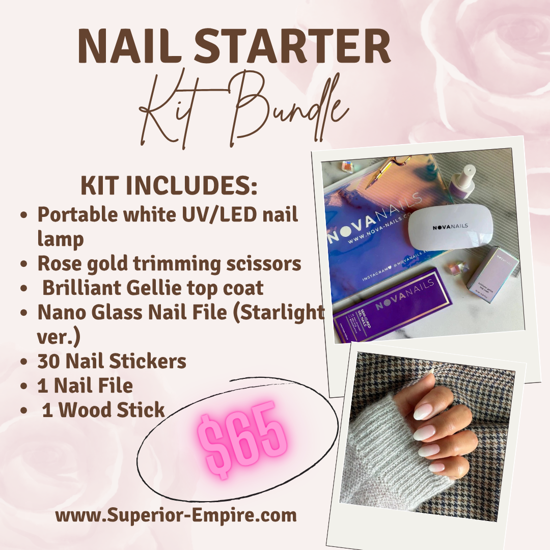 Starter Bundle includes: 1. Portable white UV/LED nail lamp 2. Rose gold trimming scissors 3. Brilliant Gellie top coat 4. Nano Glass Nail File (Starlight ver.) 5. 30 Nail Stickers 6. 1 Nail File 7. 1 Wood Stick