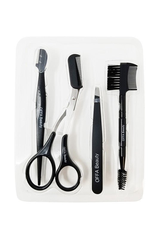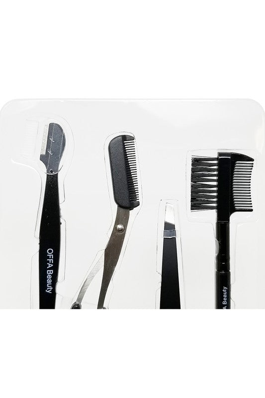 All-In-One Brow Kit 4 pcs Tool set. Includes Brow Razor W/Comb, Brow Grooming Scissors, Slant tip tweezer ,and Brush/Comb/ Spoolie.