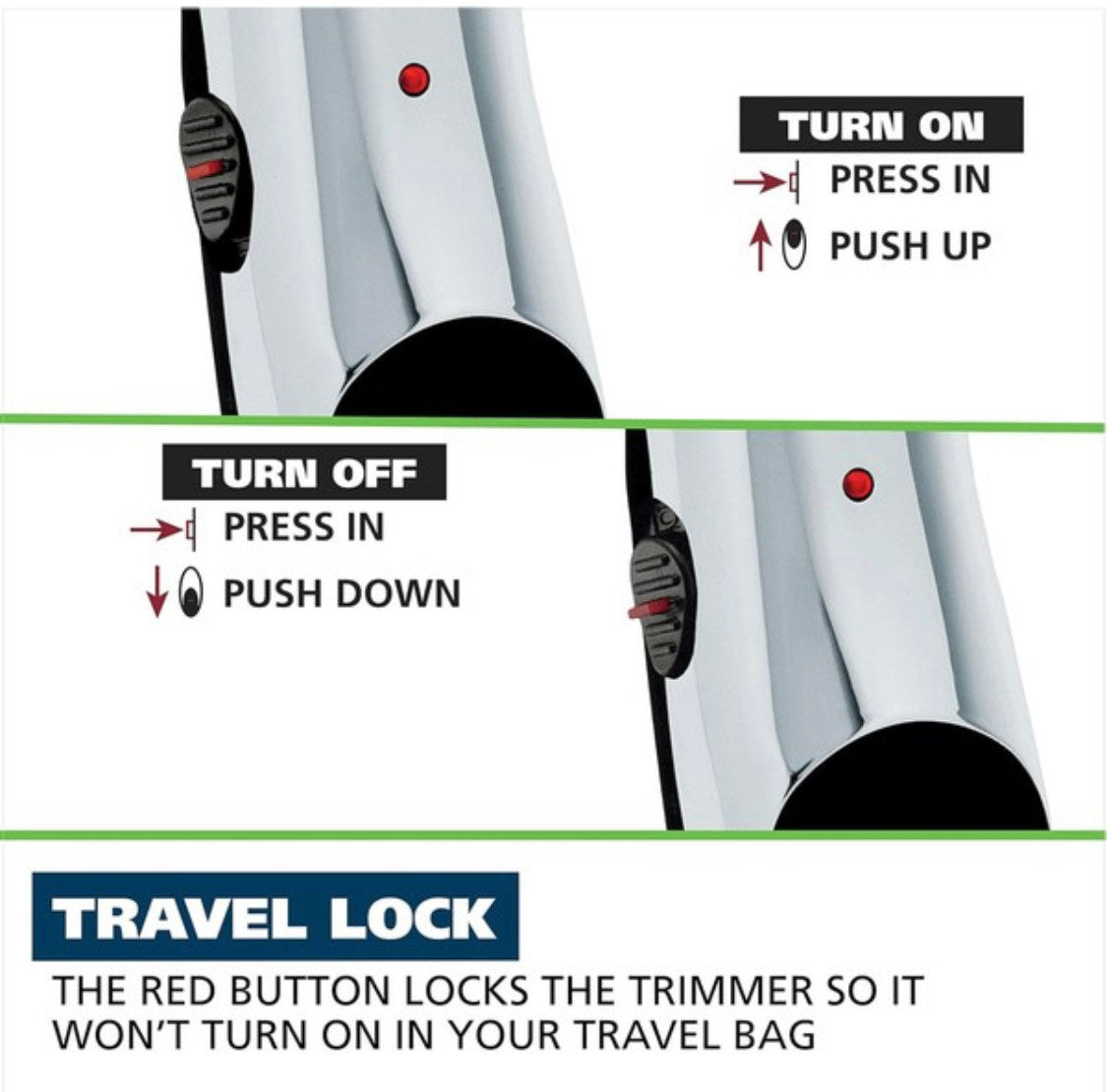 -Travel Lock- This trimmer features a LED indicator for charging that also doubles as the travel lock indicator, simply press it in and down to disengage travel lock.